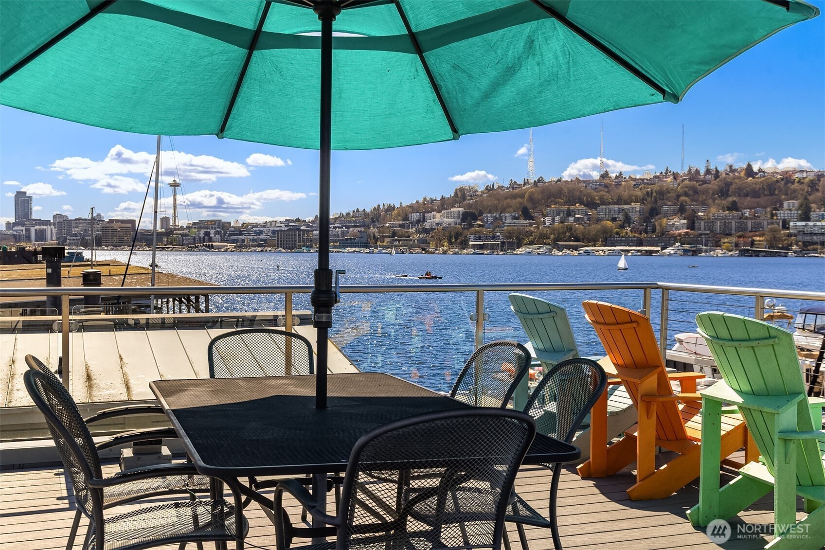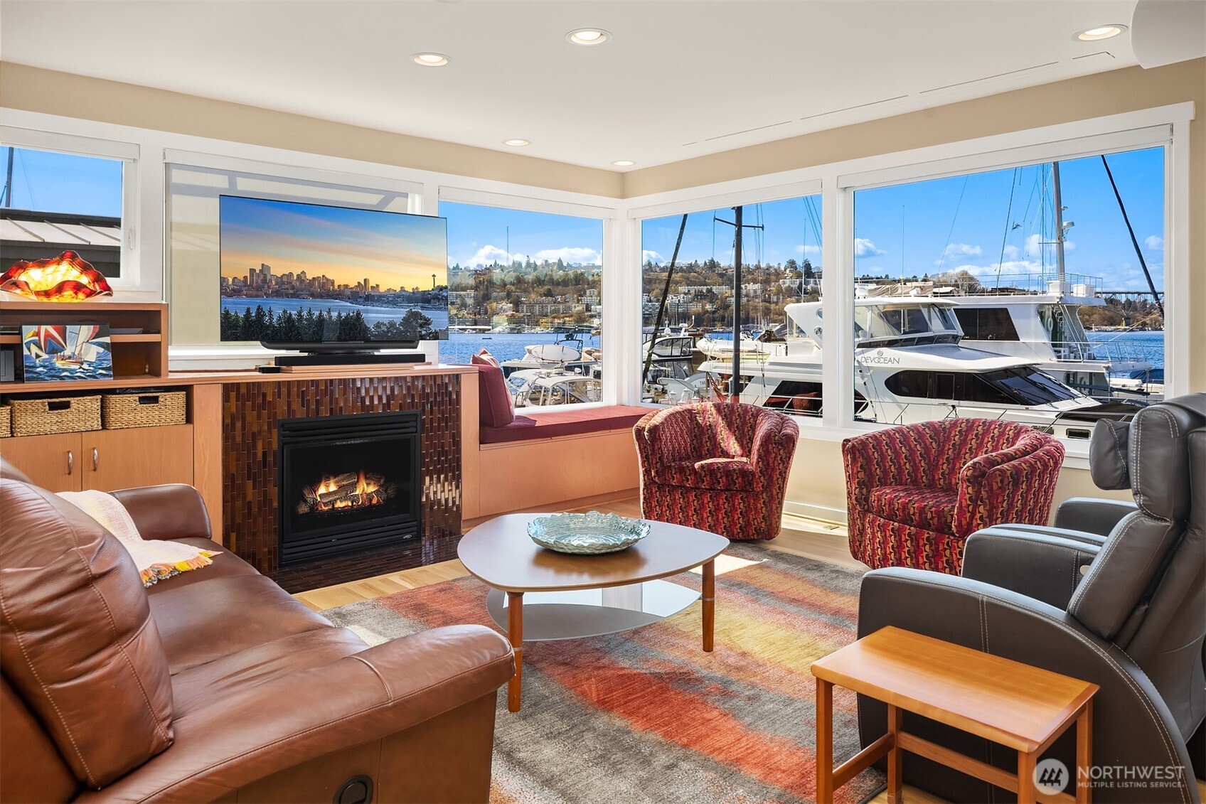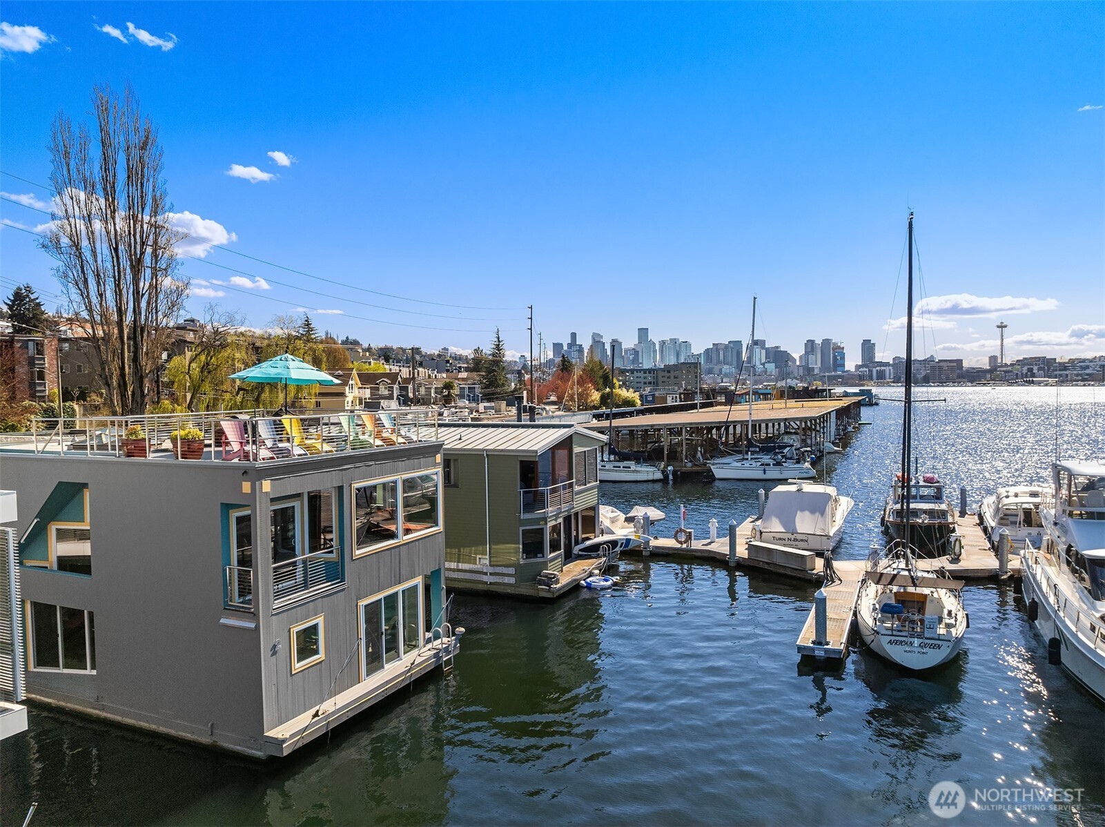 Front-row Roanoke Reef | Stunning west-facing open-water views: Space Needle, Queen Anne, Gas Works, Olympics | 2BR/2.5BA architecturally-designed | 2 secure EV-charged garage parking + storage | 2 boat moorage slips. There are waterfront homes in Seattle, and then there's the front row of Roanoke Reef. The Space Needle and Queen Anne Hill rise to the southwest, the Aurora Bridge arcs over the Ship Canal to the west, Gas Works Park sits directly across the water -- a 180-degree panorama from the living room of this floating home at the head of a gated condo-owned dock. The primary suite on the water-level floor features a built-in king captain's bed, walk-in California Closet, and sliding glass doors to two boat slips. A second bedroom has custom twin XL Murphy beds and en-suite bath. A utility room with workbench, laundry & storage opens to a boat deck. Connected via a sculptural floating staircase, the upstairs opens into the view. A living room with gas fireplace, built-in two-person office, and drop-down movie screen. A full-sized updated kitchen with built-in oven, bathed in natural light, flows into an open-view dining room that seats 8+. A full-size staircase--wide enough to carry trays & platters--climbs from the kitchen to a large rooftop deck surrounded by endless Seattle views. Day by day, float planes come & go, commercial ships work the Ship Canal, sightseeing boats & yachts cruise by, sailboats chase the wind. Year-round, the lake provides a never-ending show.