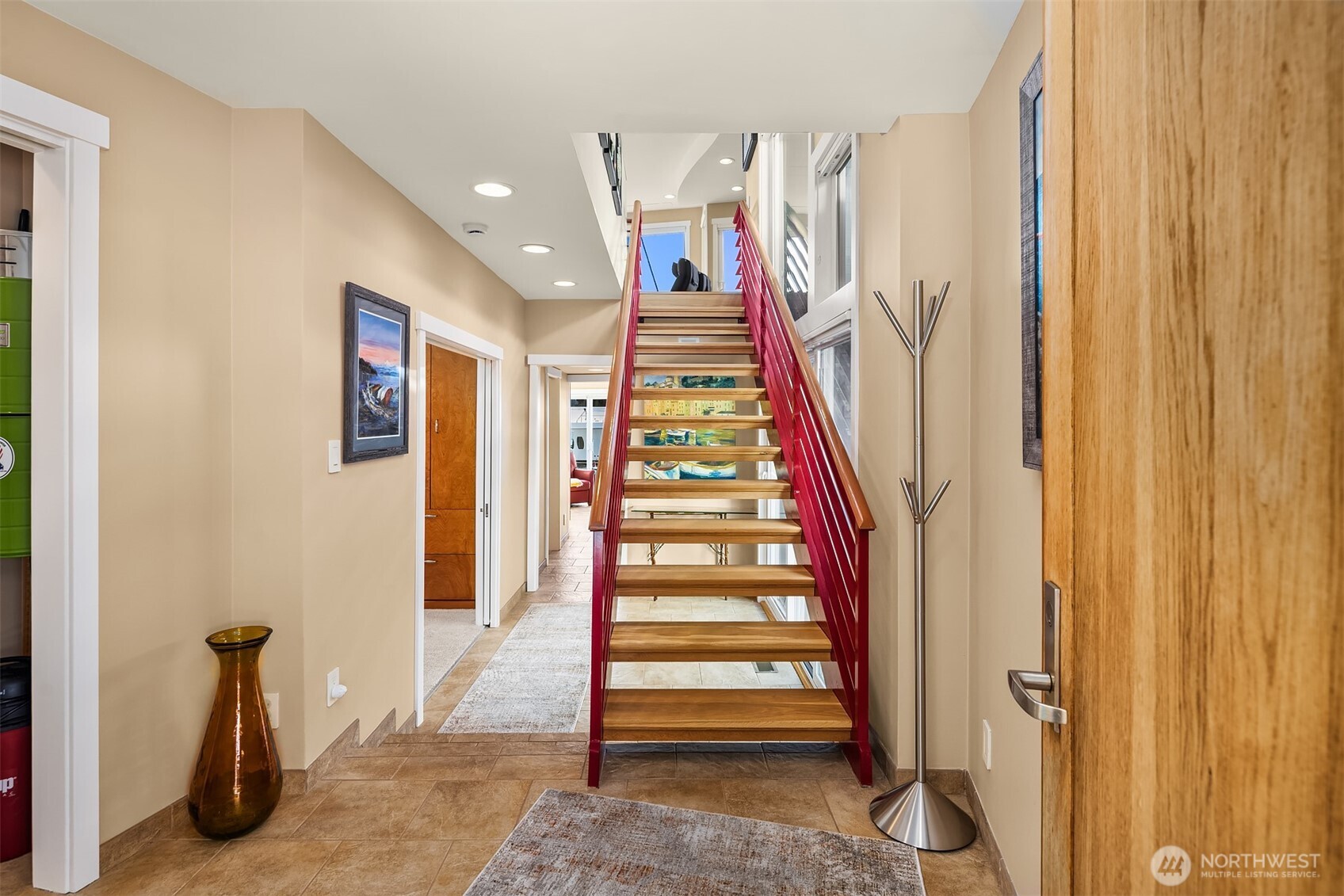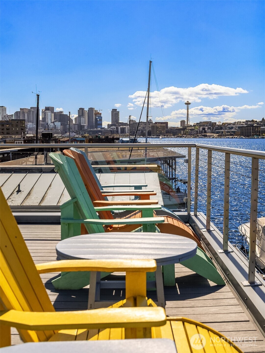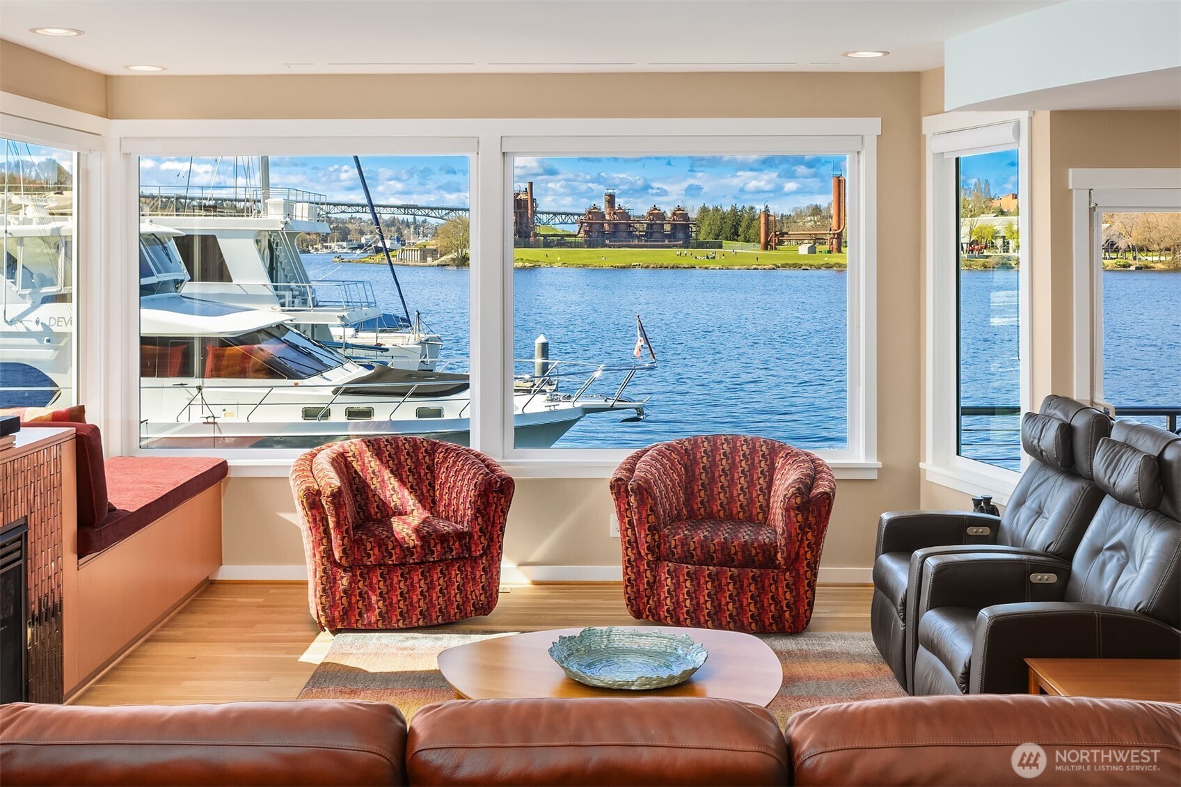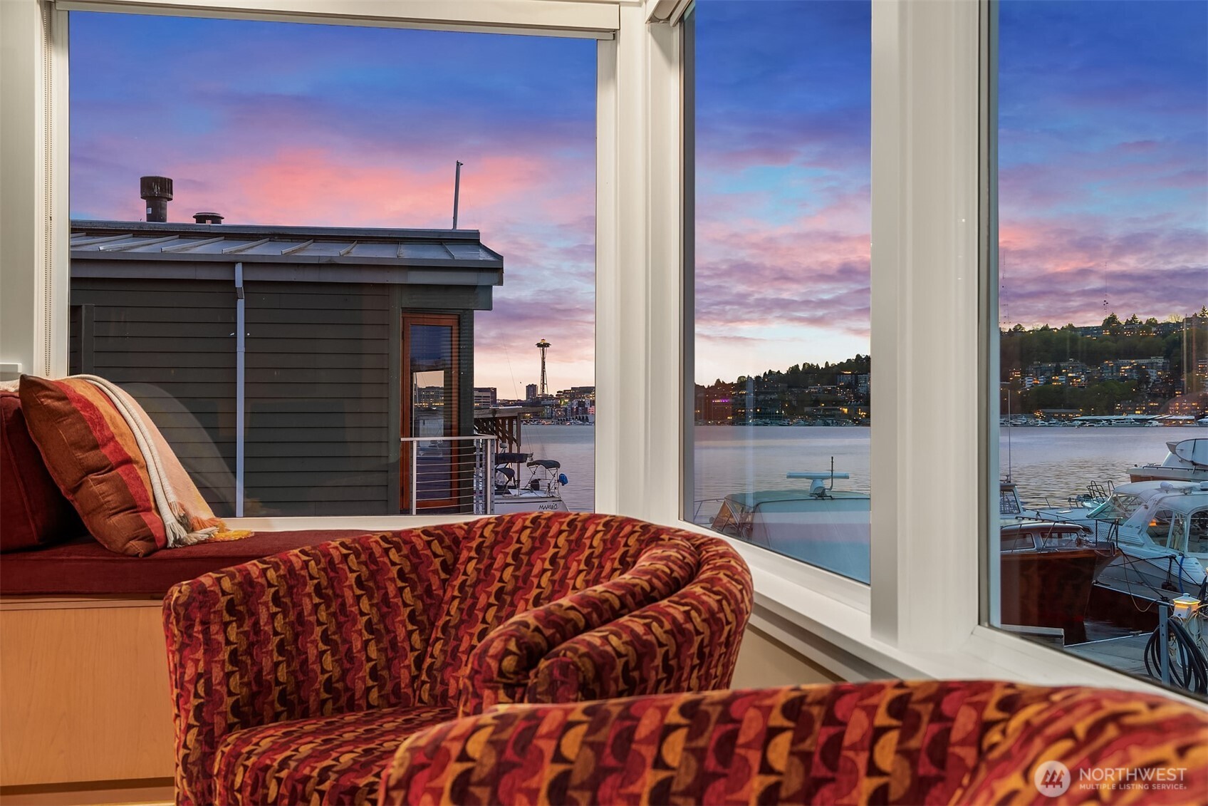 Front-row Roanoke Reef | Stunning west-facing open-water views: Space Needle, Queen Anne, Gas Works, Olympics | 2BR/2.5BA architecturally-designed | 2 secure EV-charged garage parking + storage | 2 boat moorage slips. There are waterfront homes in Seattle, and then there's the front row of Roanoke Reef. The Space Needle and Queen Anne Hill rise to the southwest, the Aurora Bridge arcs over the Ship Canal to the west, Gas Works Park sits directly across the water -- a 180-degree panorama from the living room of this floating home at the head of a gated condo-owned dock. The primary suite on the water-level floor features a built-in king captain's bed, walk-in California Closet, and sliding glass doors to two boat slips. A second bedroom has custom twin XL Murphy beds and en-suite bath. A utility room with workbench, laundry & storage opens to a boat deck. Connected via a sculptural floating staircase, the upstairs opens into the view. A living room with gas fireplace, built-in two-person office, and drop-down movie screen. A full-sized updated kitchen with built-in oven, bathed in natural light, flows into an open-view dining room that seats 8+. A full-size staircase--wide enough to carry trays & platters--climbs from the kitchen to a large rooftop deck surrounded by endless Seattle views. Day by day, float planes come & go, commercial ships work the Ship Canal, sightseeing boats & yachts cruise by, sailboats chase the wind. Year-round, the lake provides a never-ending show.