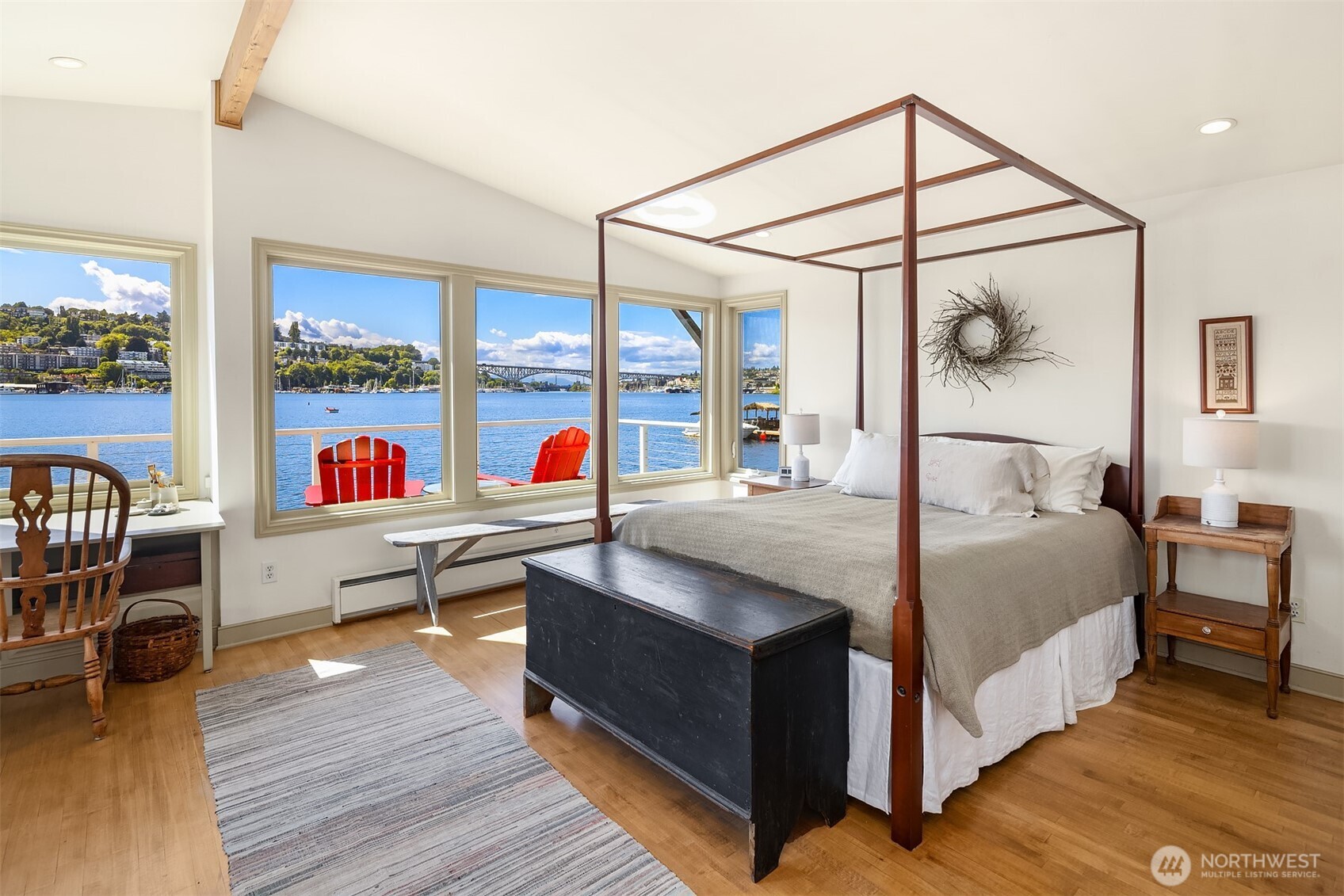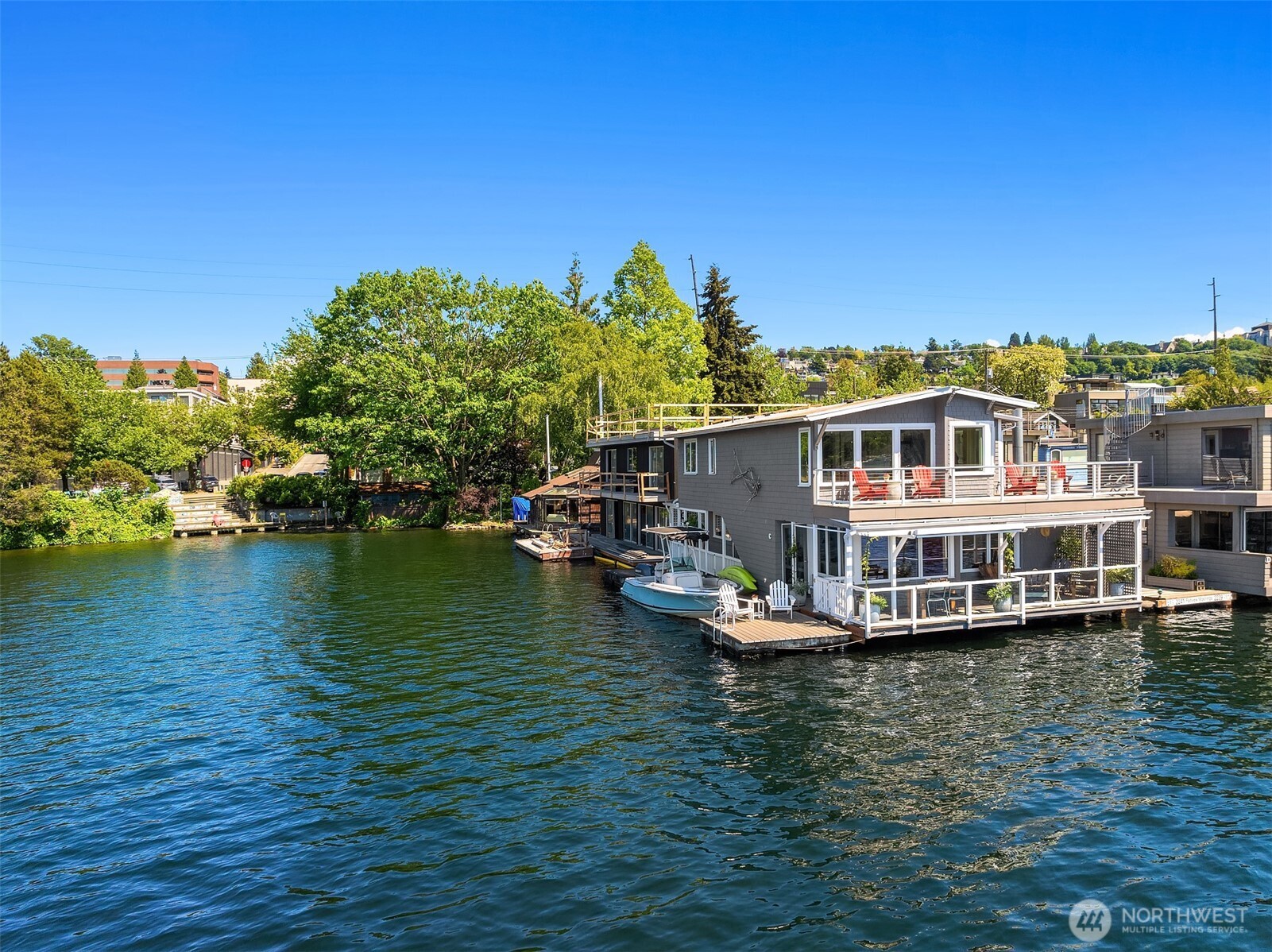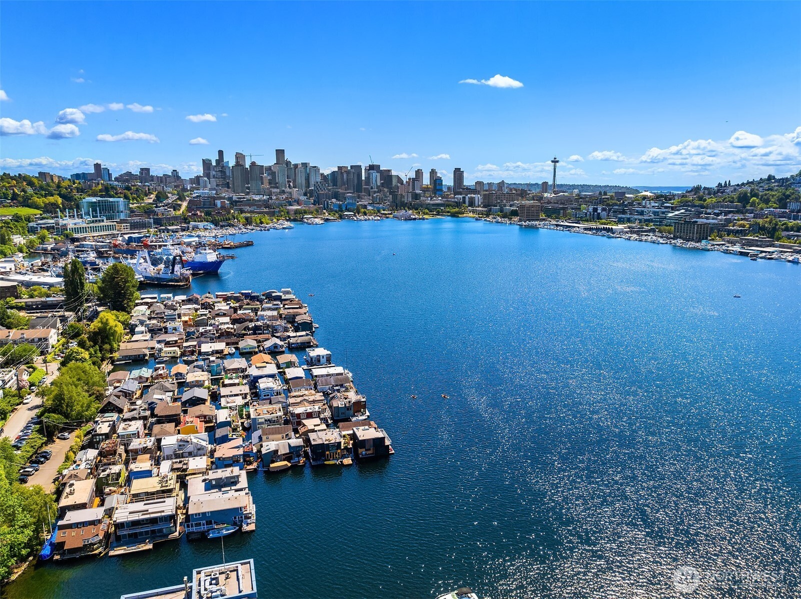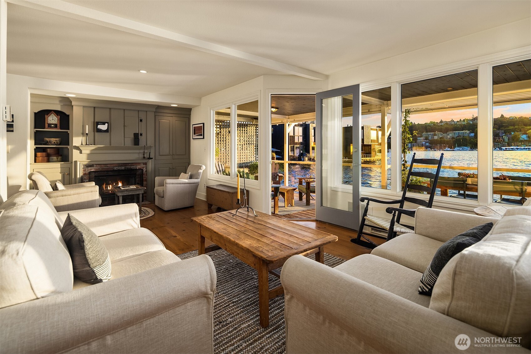 Rare, front-row classic. A floating home that captures everything we love: timeless character, thoughtful craftsmanship, a graceful blend of vintage charm and modern comfort. Wraparound windows frame postcard views of the Aurora Bridge, Queen Anne, Gas Works Park and beyond. Effortless flow on patinated pine between kitchen, dining, den and living areas where a cozy fireplace and built-ins add warmth and soul. A covered porch where sunsets and friends linger. Upstairs, three bedrooms, a vaulted primary suite with Space Needle views and private deck to bask in the sun. Boat moorage + kayak float. Shared lawn with picnic table, garden, & woodshop. Private garage. Steps from Pete's grocery, Eastlake eateries. A once-in-a-lifetime opportunity.