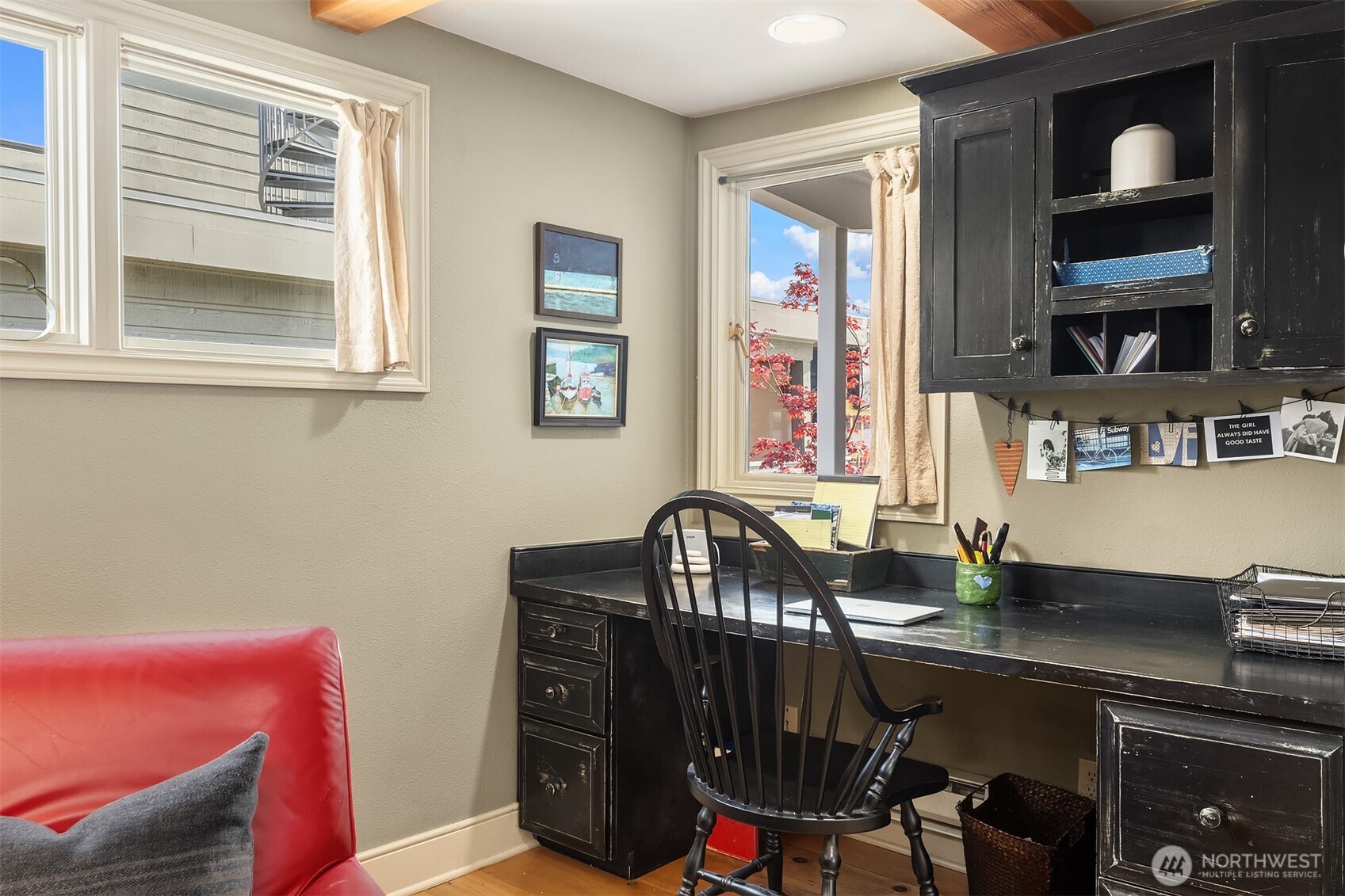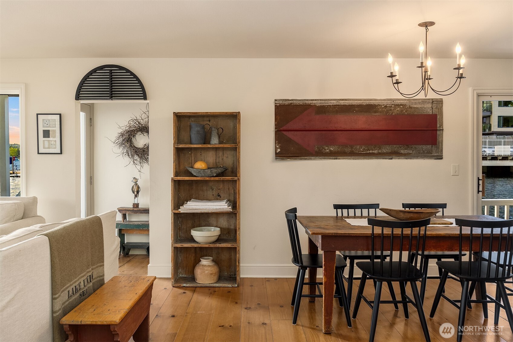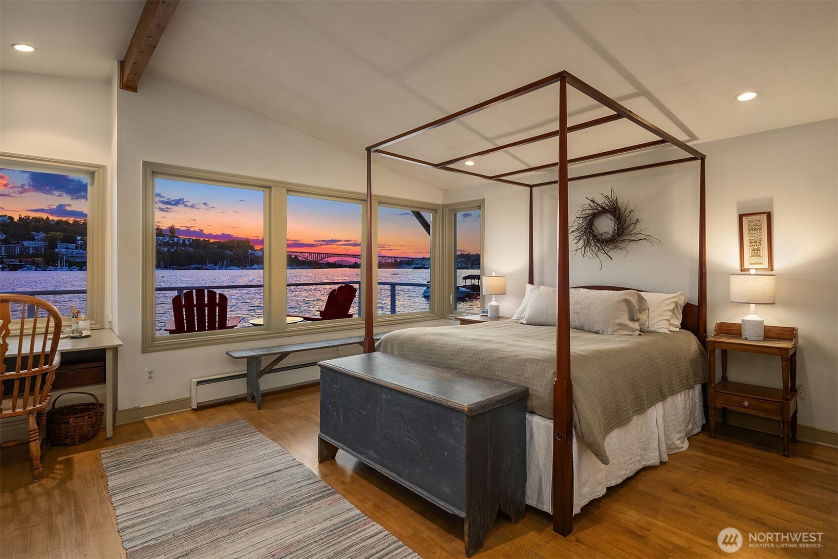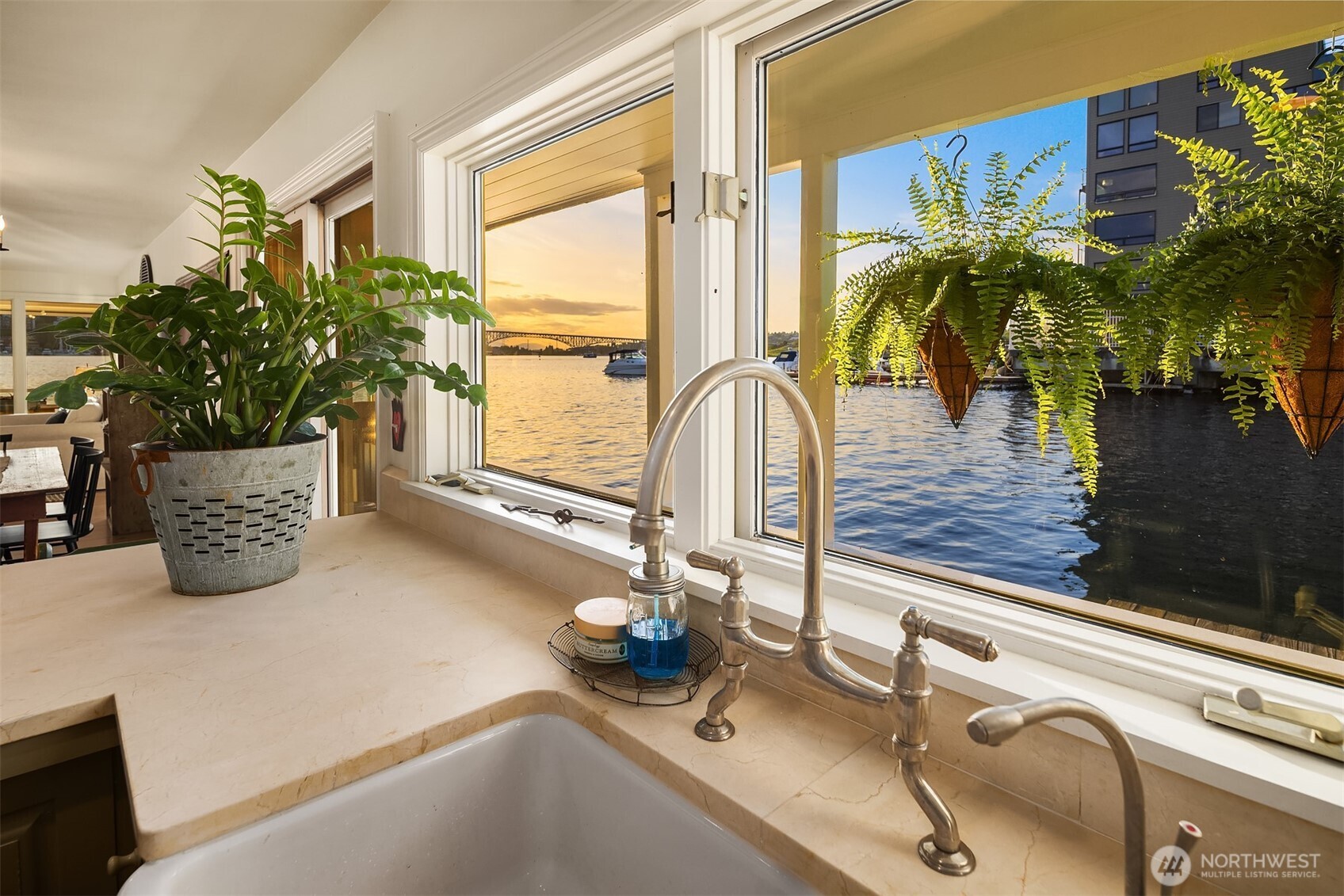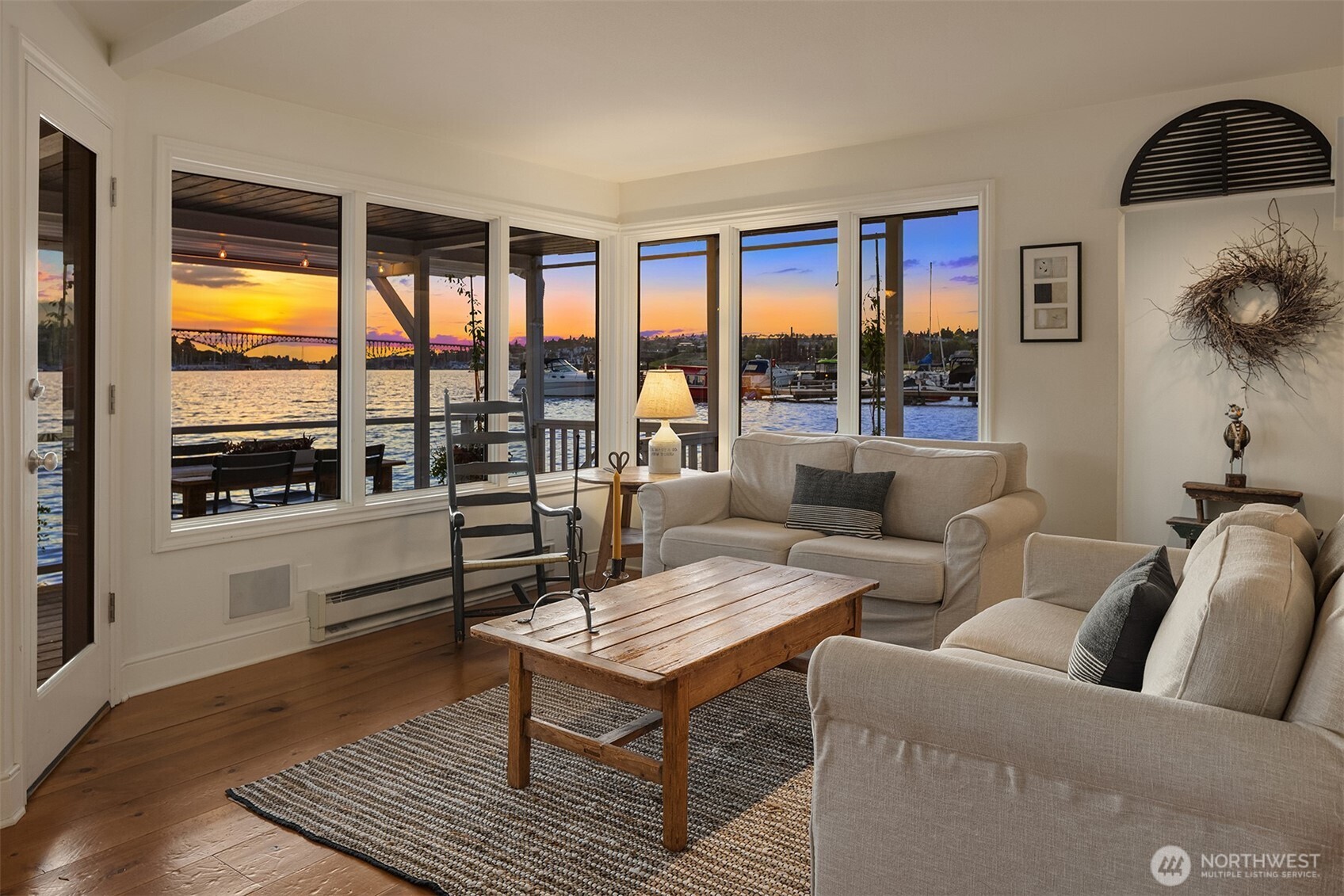 Rare, front-row classic. A floating home that captures everything we love: timeless character, thoughtful craftsmanship, a graceful blend of vintage charm and modern comfort. Wraparound windows frame postcard views of the Aurora Bridge, Queen Anne, Gas Works Park and beyond. Effortless flow on patinated pine between kitchen, dining, den and living areas where a cozy fireplace and built-ins add warmth and soul. A covered porch where sunsets and friends linger. Upstairs, three bedrooms, a vaulted primary suite with Space Needle views and private deck to bask in the sun. Boat moorage + kayak float. Shared lawn with picnic table, garden, & woodshop. Private garage. Steps from Pete's grocery, Eastlake eateries. A once-in-a-lifetime opportunity.